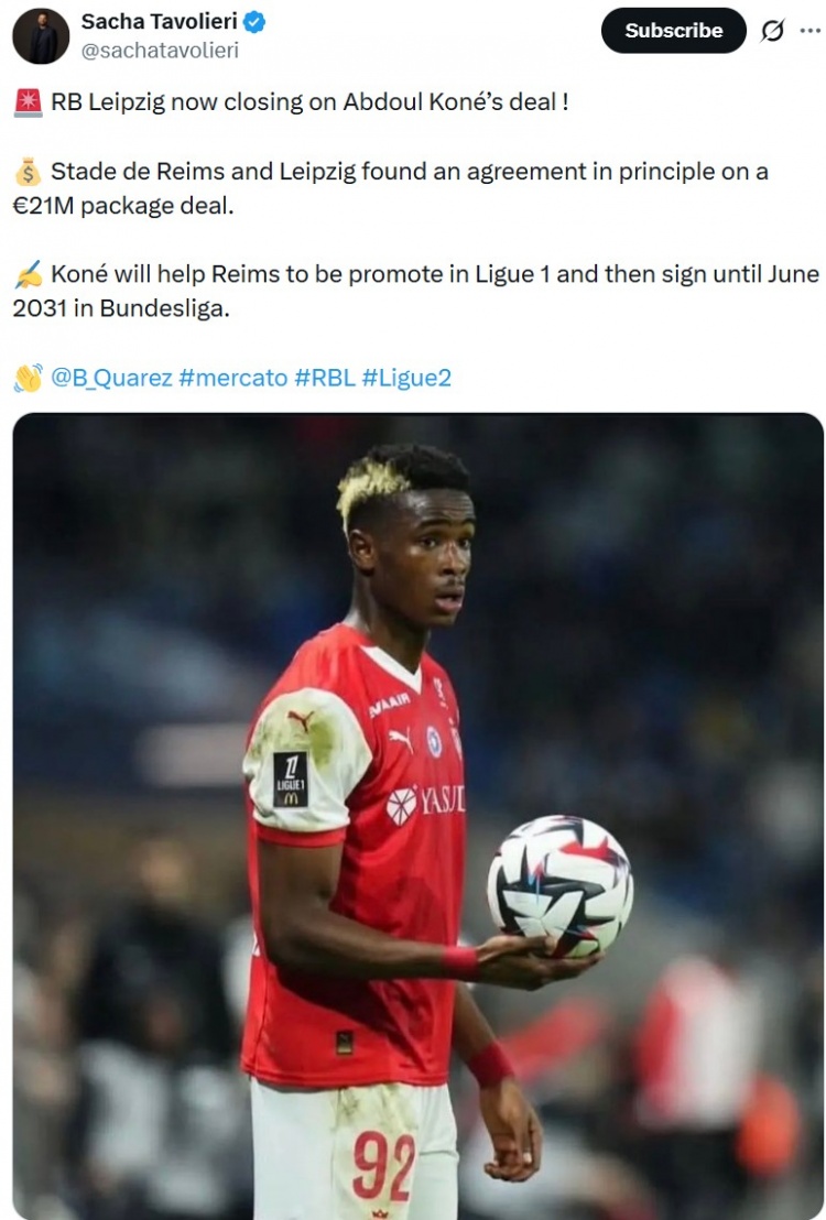 据报道,莱比锡与兰斯就科内的转会达成了原则性协议,转会费为2100万欧元。科内本赛季将尽力帮助兰斯升入法甲,并在今年6月正式加盟莱比锡,并签约至2031年6月。